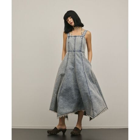 複雑なシルエットで魅せる、大人のデニムワンピース。8.5オンスのデニムを使用し、ハンカチを纏ったような構築的なサーキュラーシルエットで仕立てた美しい佇まいの一枚。イレギュラーなデザインと用尺をたっぷりとった贅沢な蹴まわしが、歩く度に優雅な動きをもたらします。長めの着丈や肩紐はやや太めに設定し露出度を抑え、大人の女性が着こなしやすく仕上げたのもポイント。ピンクは顔料染めにケミカル加工を施し、ブルーはインディゴをケミカル加工して薄くピンクベージュをのせたニュアンスのあるカラーに仕上げました。まだ肌寒い時期は上からジャケットを羽織って、暖かくなったら一枚で。春から夏に向けてのカジュアルなデイリードレスとしてご活躍いただけるアイテムです。