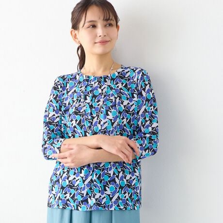 さらっとした涼やかな肌当たりで人気の素材に、幾何調の花柄をプリントしました。