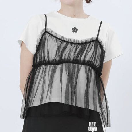 スカートにもパンツにも好相性な一枚です。Tシャツ、チュールキャミソールそれぞれでの着回しも!