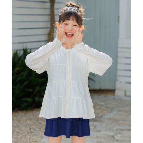 今期のラッシュガードはふんわりと広がるティアードデザインで可愛らしい1枚に仕上げました。