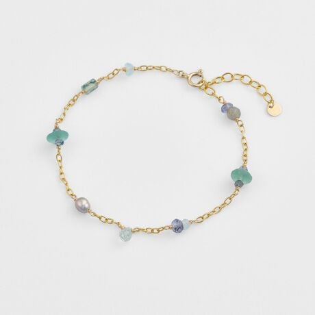 ブルーからパープルへと移ろうやさしい色合いでまとめた、魅力的なブレスレット。ゴールドのチェーンに、アガットで人気のカラーストーンをあしらいました。さりげなく色を添えることで、いつもの装いに華やかさと個性をプラスします。リズミカルに配されたステーションデザインは、一本でも手元を上品に彩ってくれるアイテムです。※天然石や天然素材を使用しているものは、サイズ・色味・風合いの違いや、若干の傷、内包物の有無などに個体差があります。予めご了承ください。※連材を使用しているため、多少の傷や欠けが見られる場合がございます。