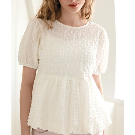 凹凸感のある立体表情のあるシアサッカー素材を使用し、肌離れが良く上品な存在感を放つペプラムブラウス。