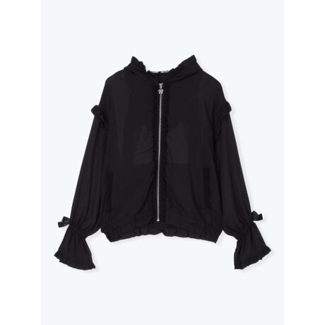 フードのうさ耳デザインと繊細なレース使いが目を引く、ガーリームード漂うシフォンブルゾン。
