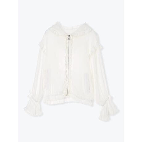 フードのうさ耳デザインと繊細なレース使いが目を引く、ガーリームード漂うシフォンブルゾン。
