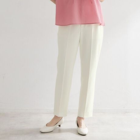 後ろウエストはゴム仕様できちんと感がありながら快適なはき心地で、通勤からデイリーまで幅広く活躍するパンツになっています。