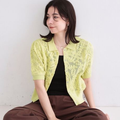立体感のあるレースモチーフ素材を使用したトレンド感たっぷりのポロニットカーディガン