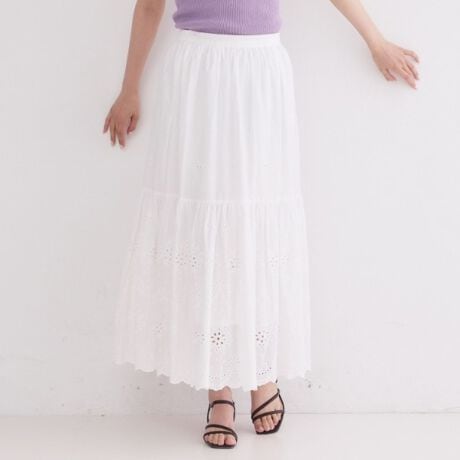 ・カットワークレースの刺繍が目を引く、華やかなマキシスカート。