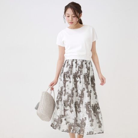 スカートは花柄プリントにランダムプリーツ加工をしています。