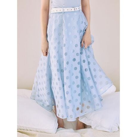 ハリ感のある素材で作成し、ふんだんなフレアシルエットが綺麗に広がった華やかな印象のフレアスカートです。生地は繊細で透け感のあるドットシアーなので軽やかな雰囲気。スカートが華やかなので、合わせるトップスによって特別なお出かけシーンにも、デイリーシーンにも様々な場面でご着用いただけます。