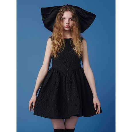 ふくれジャガード生地を使用したミニ丈のドレス。両脇ウエストにハードチュールを仕込み、裾には芯を貼ることで立体感のあるフレアシルエットに仕上げました。インナーとのレイヤードを楽しめるように上身頃はややゆとりのあるサイズ感に設定。一枚でも、重ね着でもスタイリングが広がるアイテムです。