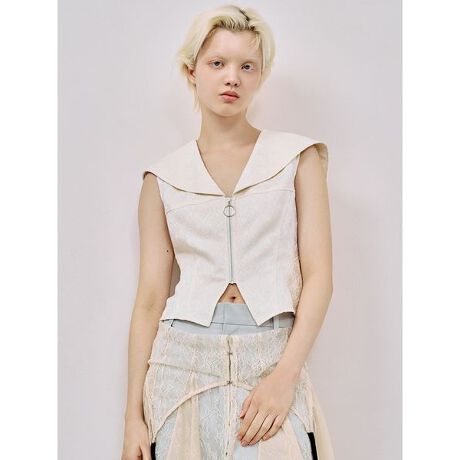 無地ライクながら華やかな印象のフクレジャガード生地を使用。クラシカルな印象の大きなセーラーカラーが、顔まわりを印象的に演出します。フェミニンなデザインでありながら、タイトなシルエットや後ろの編み上げ、フロントのファスナーディテールにより、程よく大人な雰囲気に仕上げています。ボリュームのあるスカートやパンツ、コンパクトなボトムなど、さまざまなボトムと合わせやすいブラウスです。