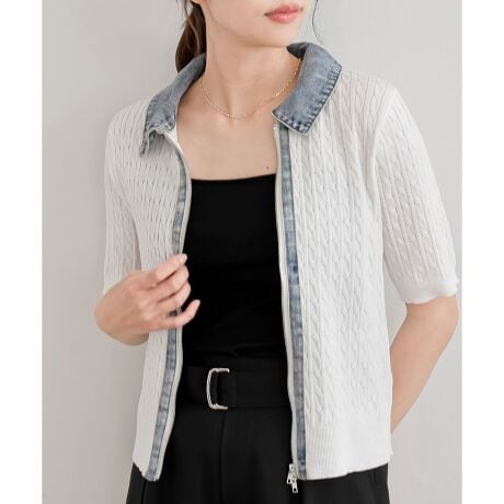 デニム切替ケーブルニットZIPプルオーバー