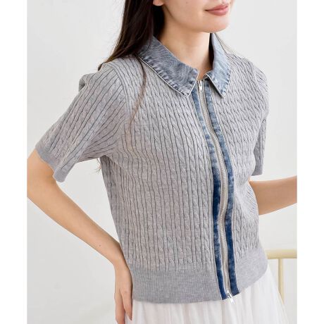 デニム切替ケーブルニットZIPプルオーバー