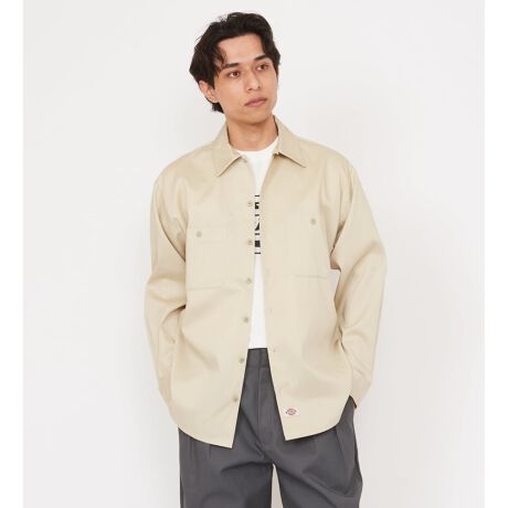 胸ポケットにはフラップ無し、トップボタンにはリングドットを使用した長 袖ワークシャツ。裾のラウンドも特徴的です。