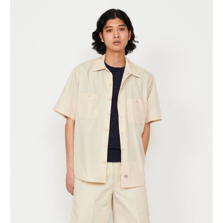 胸ポケットにはフラップ無し、トップボタンにはリングドットを使用した長 袖ワークシャツ。裾のラウンドも特徴的です。