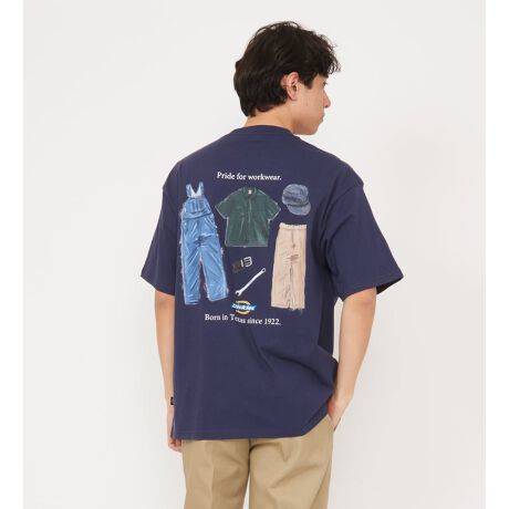 Dickiesのヘリテージアイテムを並べた手書き風グラフィックTシャツ。 ヘリテージのロゴを採用し、ブランドの歴史を強調したTシャツです。