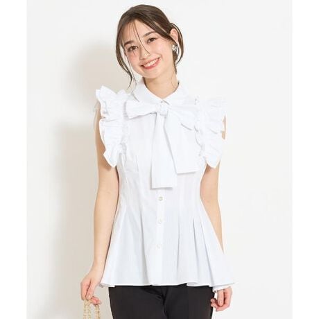 軽やかな甘さをプラスするフリルスリーブペプラムブラウス【Design】・フリルスリーブが華やかな印象を演出するペプラムブラウス。・ノースリーブデザインですっきりと軽やかな着こなしが叶います♪・ウエストにタックを施したことにより立体感のある美しいシルエットになり、裾にかけて広がるペプラムシルエットが女性らしいメリハリのあるラインに♪・ストライプ柄で甘さを抑え、すっきりとした印象に仕上げました◎・スカートにもパンツにも合わせやすく、幅広いスタイリングで活躍します!・取り外し可能なリボンタイ付き♪・フロントボタン仕様。【Fabric】・軽やかでさらっとした素材を使用し、快適な着心地に。・程よいハリ感があり、ペプラムのシルエットをきれいにキープ。・ご自宅でお手入れが出来るのも嬉しいポイント♪・ホワイトストライプ、ブルーストライプ、ブラックストライプの3色展開となります。【Care】手洗い可能