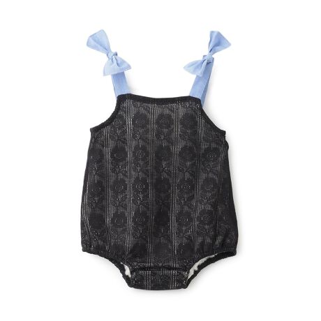 オムツ交換に役立つ、スナップボタンを配した股部分の設計もポイント。
