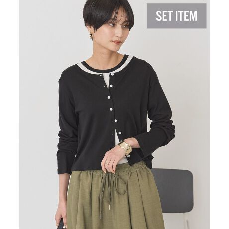透け感のあるコンパクトサイズのカーディガンとトレンド感のあるリンガーTシャツのセット。モノトーン配色が大人シックな着こなしにぴったりです。カーディガンは伸縮性に優れ、繊細な凹凸感のある素材と小さめの釦が並ぶ旬のデザインで、裾や身幅のバランスですっきり見えます。単品使いでも汎用性が高くどんなボトムスにも合わせやすい一着です。