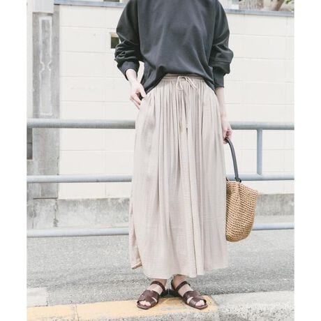 ウエストがイージー仕様のため、着用位置を調整しやすく、低身長の方にもバランスよく着ていただけます。程よいボリューム感のあるシルエットで、体のラインを拾いにくく、すっきりとした印象に仕上がります。