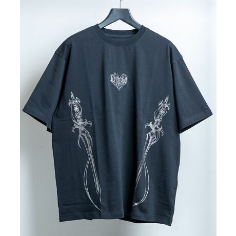 フロントにはダガーモチーフのプリントとハート刺繍を配置。