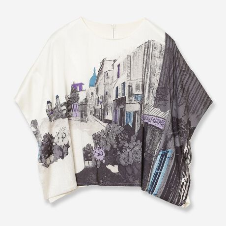 ヨーロッパの景色や建物を描いたアーティスティックな柄で、1枚でコーディネートの主役になります。