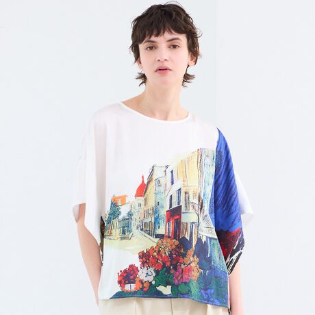 ヨーロッパの景色や建物を描いたアーティスティックな柄で、1枚でコーディネートの主役になります。