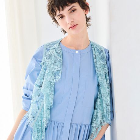 光沢があり非常に繊細、曲線的なスカラップが特徴で、コーディネートに華やかさと軽やかさをプラスする総レースのジレです。