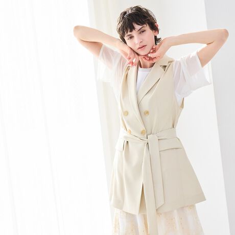 麻のような清涼感がありながらシワになりにくく、ストレッチ性が高い人気素材を使用したミドル丈ジレ。