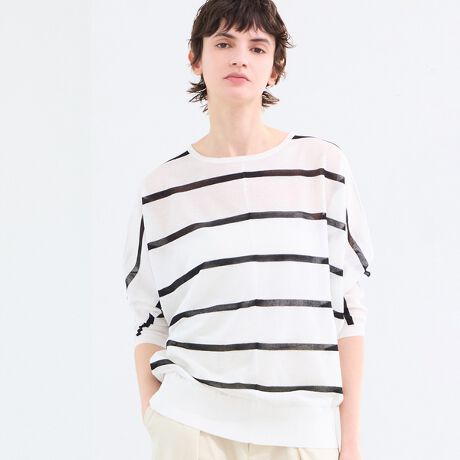 普通のボーダーTシャツだと子供っぽくなりがちですが、透け感があることで、大人に似合う「抜け感」と「色気」を兼ね備えたトップスに仕上がりました。