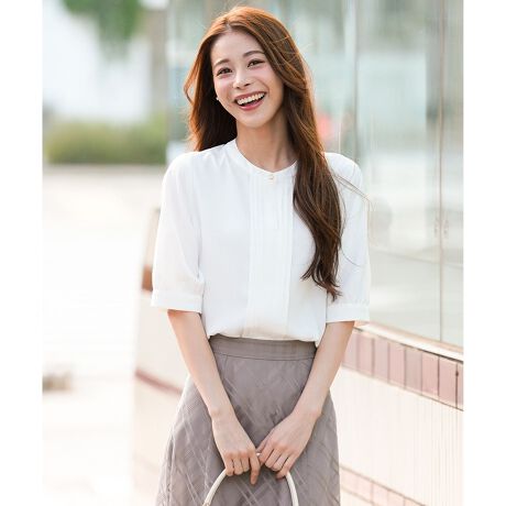 ・バンドカラーがきちんと感を演出するブラウス・比翼前立て風デザインですっきりとした印象に・タック部分のステッチが見えない繊細仕立て・二の腕が隠れる袖丈とカフスデザインが1枚でも着映える・襟元のボタン1つで簡単に着脱が可能な被りデザイン