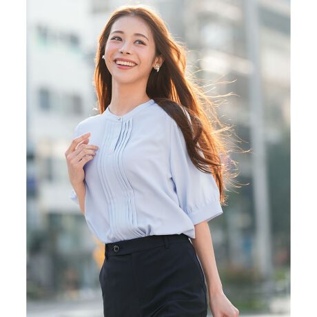 ・バンドカラーがきちんと感を演出するブラウス・比翼前立て風デザインですっきりとした印象に・タック部分のステッチが見えない繊細仕立て・二の腕が隠れる袖丈とカフスデザインが1枚でも着映える・襟元のボタン1つで簡単に着脱が可能な被りデザイン