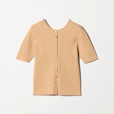 多めに付けたボタンとロールさせた襟ぐりをポイントにしました。