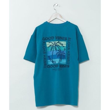 [型番:4CA-6217-2026]表情豊かなふくれジャカード素材を使用したメンズTシャツ。立体感のある生地に、サーフ感漂う刺しゅうとプリントを組み合わせたデザインが目を引きます。一枚で存在感があり、デニムやショーツと合わせてハワイの風を感じるカジュアルスタイルにおすすめです。