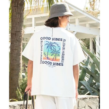 [型番:4CA-6217-2026]表情豊かなふくれジャカード素材を使用したメンズTシャツ。立体感のある生地に、サーフ感漂う刺しゅうとプリントを組み合わせたデザインが目を引きます。一枚で存在感があり、デニムやショーツと合わせてハワイの風を感じるカジュアルスタイルにおすすめです。