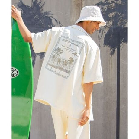 [型番:4CA-6225-2026]凹凸のあるワッフル調素材で仕立てたメンズシャツ。肌離れが良く、さらりとした着心地が魅力です。ヴィンテージ感のあるたっぷりとした刺しゅうが存在感を放ち、コーディネートの主役に。デニムやハーフパンツと合わせて爽やかなサーフスタイルにおすすめの一着です。