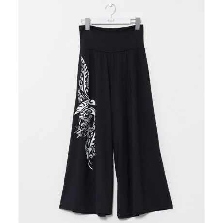 [型番:4CP-6205-2026]落ち感のあるワイドシルエットが美しいパンツ。さらりとした素材が軽やかに揺れ、スカートのような上品な印象を演出します。サイドにはリーフやティアレ、トライバル柄を大胆にプリントし、ハワイの自然や伝統を感じさせるデザインに。ウエストは幅広仕様で安定感があり、リラックスしたはき心地。一枚でリゾートムードあふれるコーディネートにおすすめです。
