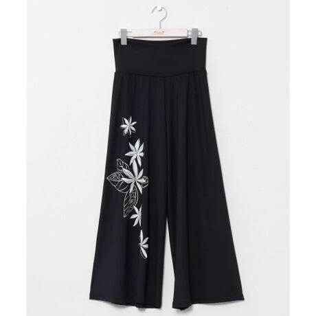 [型番:4CP-6205-2026]落ち感のあるワイドシルエットが美しいパンツ。さらりとした素材が軽やかに揺れ、スカートのような上品な印象を演出します。サイドにはリーフやティアレ、トライバル柄を大胆にプリントし、ハワイの自然や伝統を感じさせるデザインに。ウエストは幅広仕様で安定感があり、リラックスしたはき心地。一枚でリゾートムードあふれるコーディネートにおすすめです。