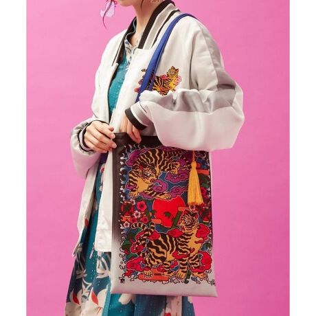 [型番:7IKP6201-2026]【倭物やカヤ×中村杏子】可愛らしい表情の動物たちをポップな色使いで描いたトートバッグ。A3サイズの荷物も入る大きめサイズで荷物をたっぷり収納できます。日常使いからおでかけまで幅広く活躍します。