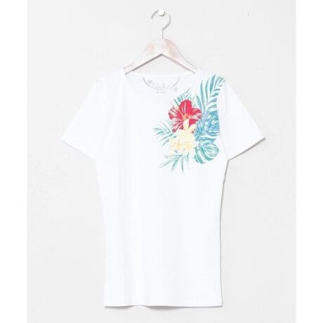[型番:4CA-6202-2026]肌触りの良いコットン素材で仕立てたTシャツ。身体のラインを美しく見せるシルエットに、華やかで繊細なボタニカル柄をあしらいました。部分的に施されたラメプリントがきらりと光り、さりげないアクセントに。デニムやスカートと合わせて上品なリゾートスタイルを楽しめる一着です。