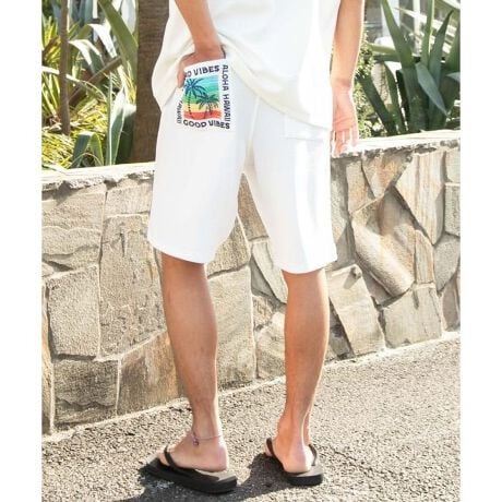 [型番:4CA-6219-2026]立体感のあるふくれジャカード素材を使用したメンズハーフパンツ。凹凸のある生地に、サーフ感漂う刺しゅうとプリントをあしらい存在感のあるデザインに仕上げました。程よくゆとりのあるシルエットで動きやすく、Tシャツやタンクトップと合わせたリラックスコーディネートにおすすめです。