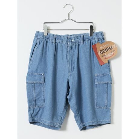 カーゴポケットがアクセントになったデニムショートパンツです。カーゴポケットに加えて、スラッシュポケット×2とバックポケット×1の5ポケット仕様。フロントファスナー、ベルトループ付き、ドローコード付き、ウエストシャーリング仕様です。