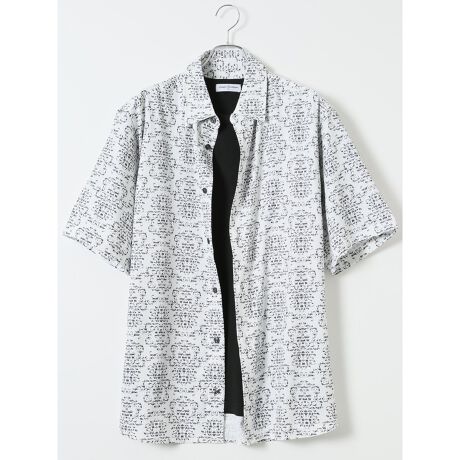 レギュラーカラー半袖シャツとjクルーネック半袖Tシャツのアンサンブルです。モノトーンを基調にした総柄プリントでモードな雰囲気に仕上げています。お洒落なレイヤードスタイルが簡単に完成する、うれしいセット企画。2枚セットで着るのはもちろん単品としても着回し可能です。
