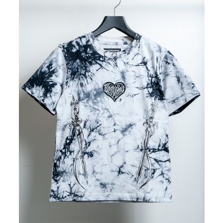 フロントにはダガーモチーフのプリントとハート刺繍を配置。