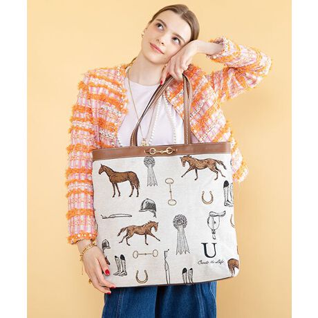 クラシカルな馬蹄とビットモチーフに、さりげなく「U」アイコンを織りで取り入れたジャガードビッグトートバッグ。