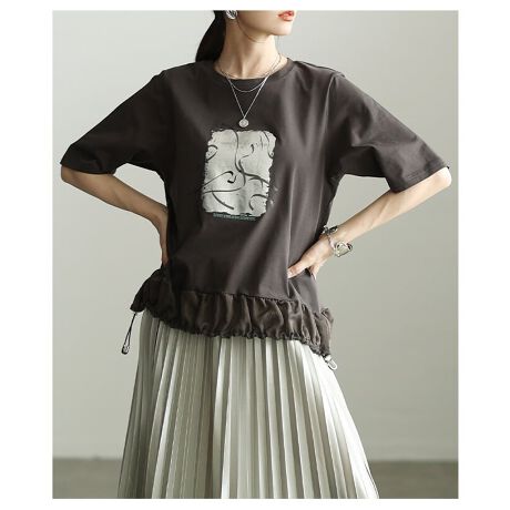 箔プリントがさりげなく輝くTシャツ。裾はオーガンジー切替で軽やかな抜け感をプラスし、ドローコードでシルエット調整も可能。シンプルなのにしっかり映える一枚です☆