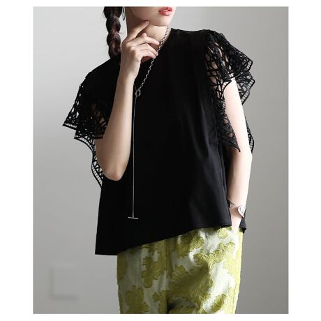 【カットソー】 レディース トップス ノースリーブ フリル袖 レース 綿100% カジュアル 春 夏