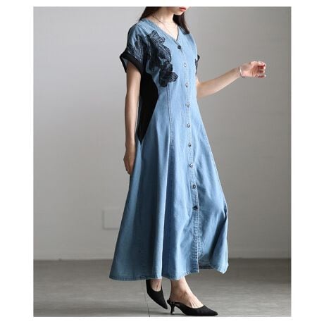 マルイウェブチャネル   /   サワアラモード   /   ワンピースドレス   /   ワンピース   /   【ワンピース】 異素材 デニム カットソー レース フレア Vネック フレンチスリーブ ロング 青