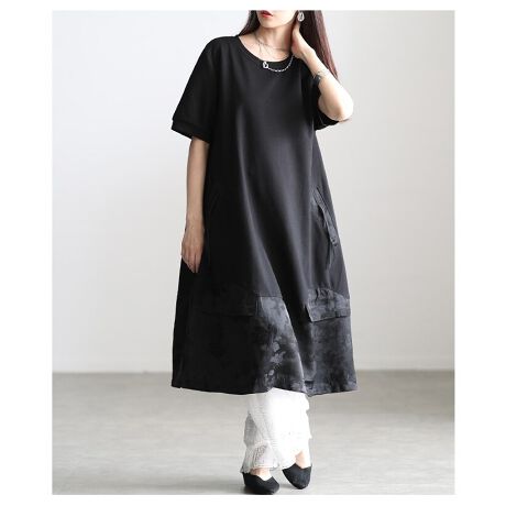 【ワンピース】 カットソー 異素材 花柄 シノワズリ 半袖 ミモレ ポケット フラップ ブラック 黒