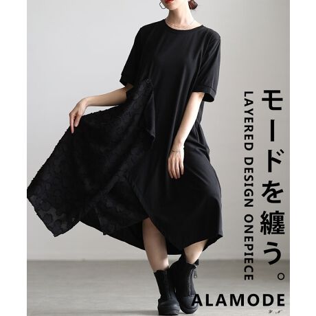 【ワンピース】 カットソー アシンメトリー 花柄 ジャガード レイヤード 変形 ティアード ブラック